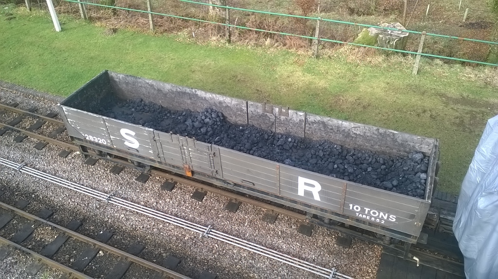 7. Several unusual railway views are possible from the scaffolding. Looking down onto the coal wagon bogie open SR No. 28320 stabled on the down platform today.