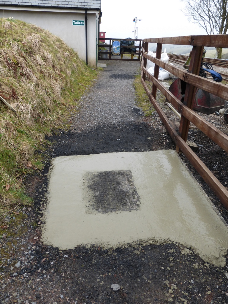 7. Having some spare concrete to hand, the opportunity was taken to concrete in the drain cover on the approach to the toilet block. The high quality floated finish was courtesy of Dave!
