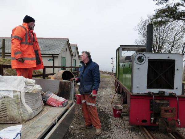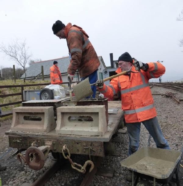 6. As the support saddles that support the point rodding are no longer commercially available, we have to make them ourselves. Here Jim loads concrete into the custom made moulds, while Martyn vibrates the concrete to ensure it reaches all parts of the mould. The results of previous castings can be seen stacked on the wagon in front of of the moulds.