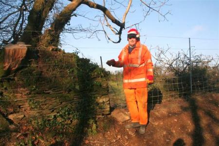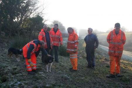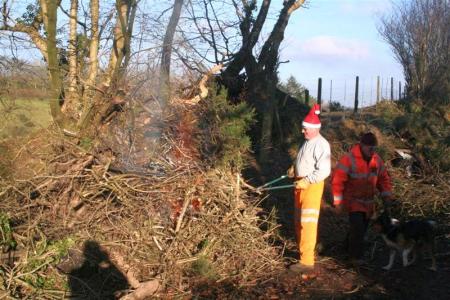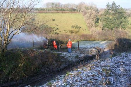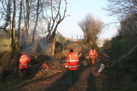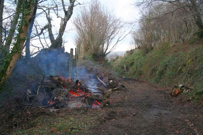 Still cold, but a bright dry day. In order to keep warm and to shift and burn the cut down trees on the trackbed at Rowley Cross cutting, Parracombe, some of the gang were tasked with enjoying bonfires there.