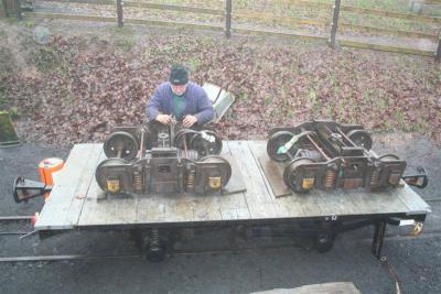 2. The bogies were lifted onto flat wagon No.52 for ease of access and high pressure hose cleaning.
