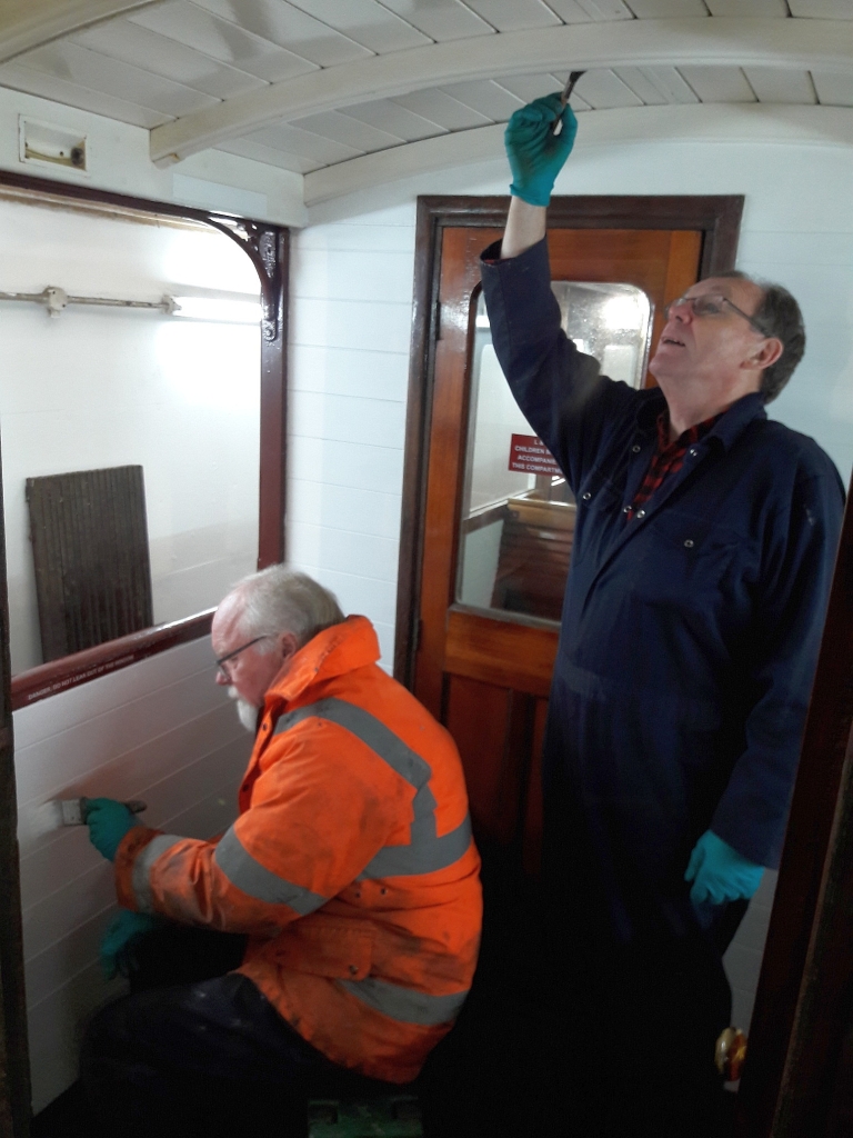 11. Jim Pounds and Barrie Cann continue to repaint the inside of the observation compartment of carriage No.7.