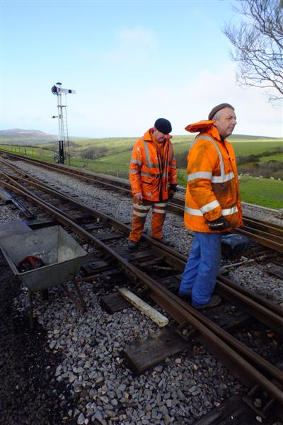 3. Dick Gunn and Martyn Budd wait for the points to be operated to check that adjustments made have been successful. Dick wonders why he always gets to work in the coldest spots on the railway!