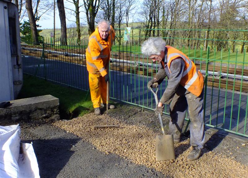 4. Graham Bendell and John Heys finish off spreading new chippings over the drain in the disabled car park.