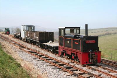 However, before the first train at 10:30 a short works train was run with HEDDON HALL and MOD flat No.52 taking a pallet of new base plates down the line. These base plates were obtained through the exchange of some surplus 60lb rail. These plates will be used to replace some of the “temporary” spiked base plates installed during the 2008-9 programme of renewing the short lengths of rail with the longer 30' lengths.