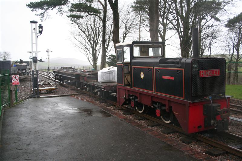 7. The works train pauses at Woody Bay during the shunt move. (The up starter signal arm has been removed for repainting)