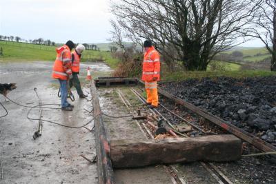 4. The compressor on flat wagon No.52 supplied air to ease the unscrewing. Brake Van No.56042 was on hand as shelter from the occasional wintery showers.