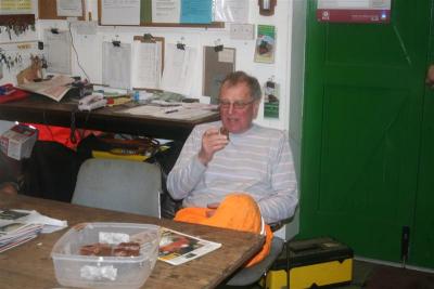 8. After moving away 'up country' , former regular volunteer Richard Willey - who has missed us so much this late autumn - returned to the gang today during his winter holiday break in Somerset. Richard tucks into some chocolate cake during the final tea break before going home time.