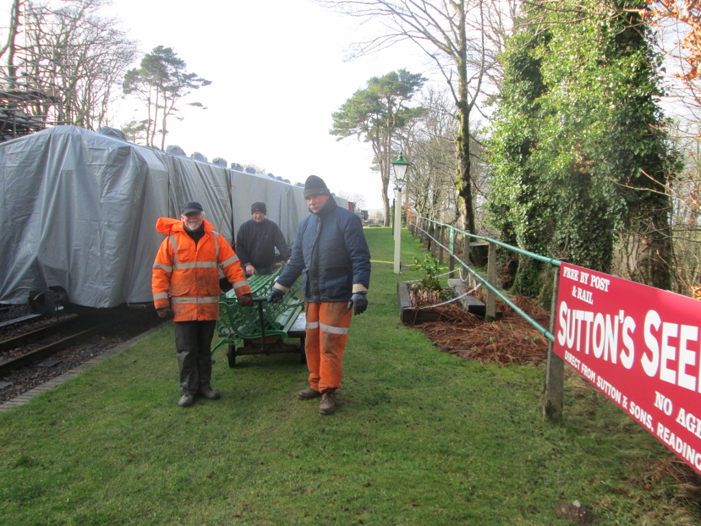 5. Jim, Dave and Graham Varney use the platform trolley to move the seats from the down platform, over the newly installed barrow crossing, closer to the running shed.