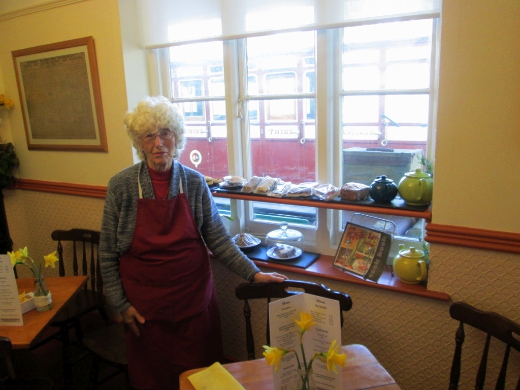 3. In the Tea-Rooms, volunteer Irene Cross poses by the cake displays on the new window shelf…..
