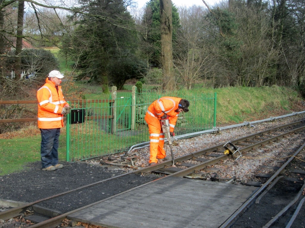 10. There was some track maintenance today as Ali Burgess takes a turn with the Kango hammer packing stone around the pointwork at the Lynton end of the station.