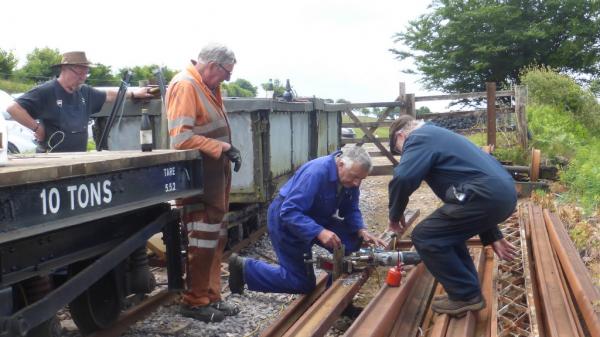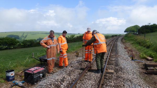 Old sleepers were removed, new ones installed, holes drilled to take the track screws and the screws tightened down. A successful, if hard day's work by Dave, Malcolm, Roger, Ali, Dave, Don and Mike, following on from last week's sleeper work, resulted in another 16 sleepers replaced with ones of better quality more suited to withstand the North Devon weather.