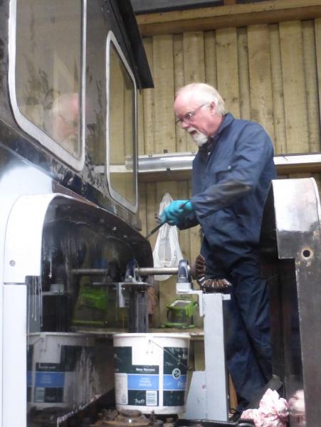 13. Jim Pounds was preparing PILTON’s modified cab for painting. The recently installed handbrake mechanism can also be seen.