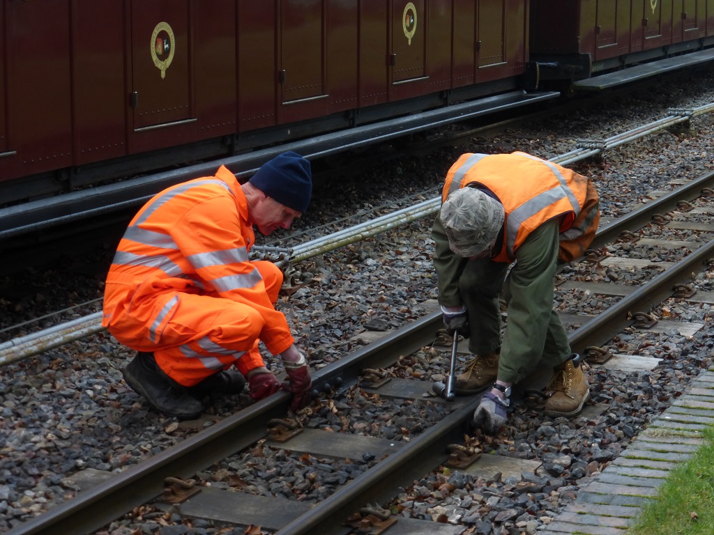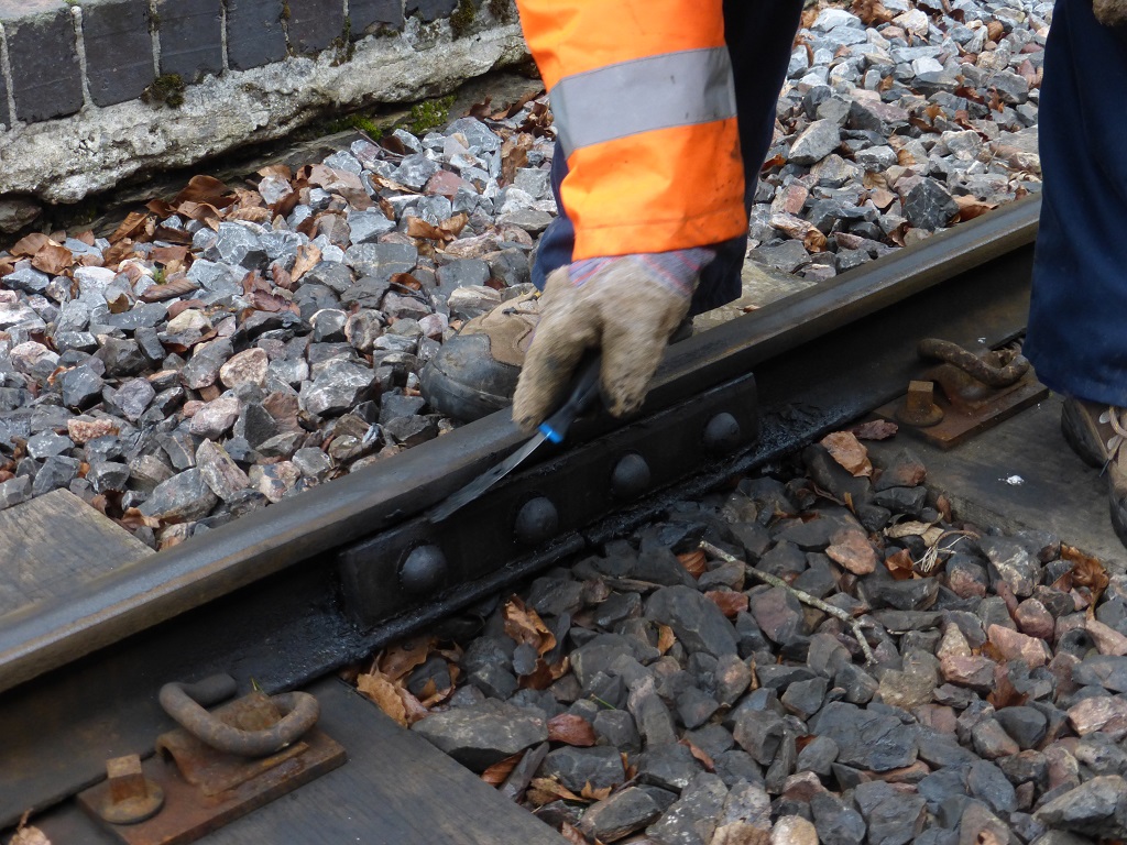 6. A start was made today on the task of fishplate greasing in the Station roads. To accommodate the expansion and contraction of the rails, the rail joints and fishplates need to move. Annually or thereabouts, the fishplates are loosened and grease applied to them before re-tightening. Several members of the current Thursday Gang had yet to experience this treat!