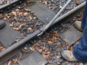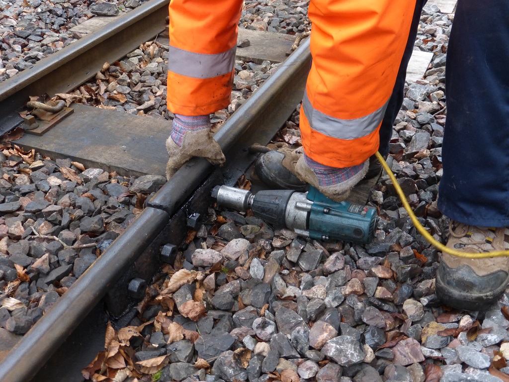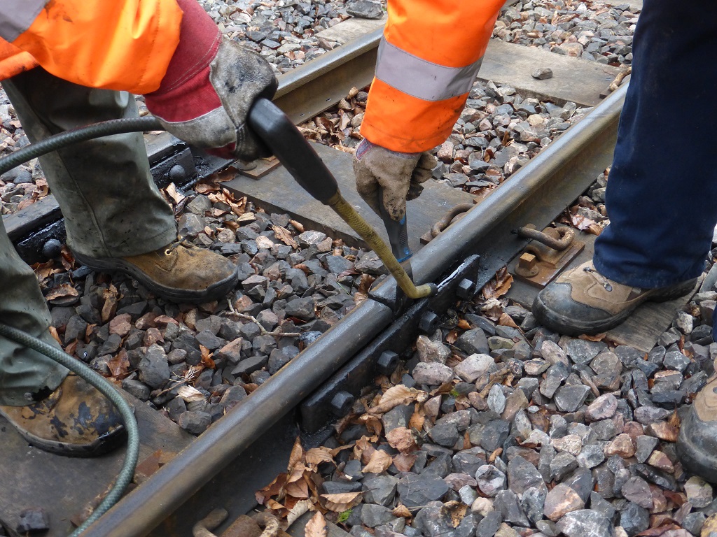 7. First, the nuts and bolts are loosened and the fishplates are freed from the rail with a good solid hammer blow.