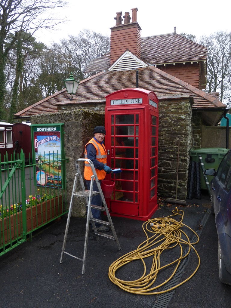 13. After sweeping the platform thoroughly of accumulated winter debris, Keith Lamprey turned his attention to the heritage phone-box. Maybe he was thought too well qualified for this, as he had recently retired after a 30-year career with BT!
