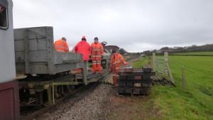 6. & 7. Stacks of new sleepers were left at both accommodation crossings in advance of next January's "Winter Working Weekend". By the end of the day many of the 200 sleepers had been distributed along the line.