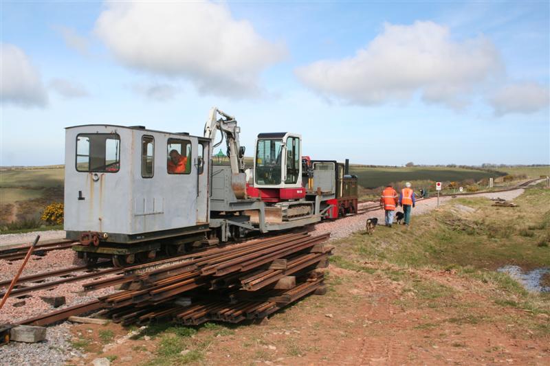 3. The works train down the line with the digger able to lift and recover the remaining long rails stored near Bridge 67.