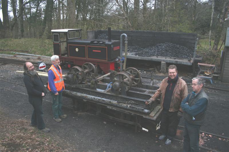 11. The upturned flat wagon on top of ex MOD flat No 52 also attracts discussion from volunteers Dave Blencowe, Julian Sinclair and Dave Tooke whilst diesel HEDDON HALL awaits to go on shed.