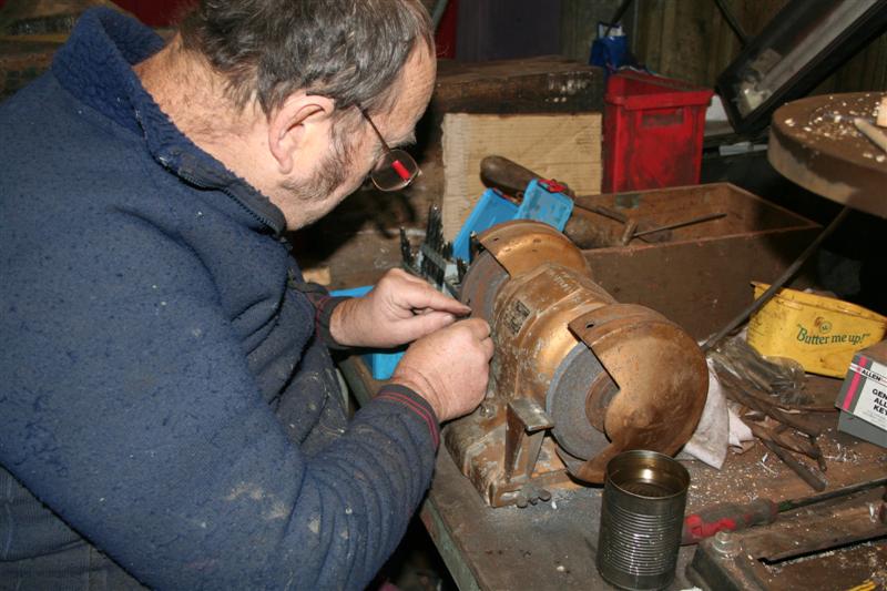 13. Long standing regular active volunteer Richard Burgess sharpens drill bits on the bench grinder.