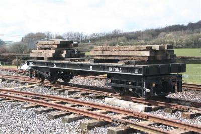10. Another rolling stock project now underway at Woody Bay is the regauging of another ex MOD 4 wheel flat wagon formerly from the RN Arnaments Museum at Gosport. The wagon has been upturned onto MOD flat No.52 to enable work on the regauged wheelsets and brake gear adjustments. Martyn Budd and Jim McFarlane discuss this work.