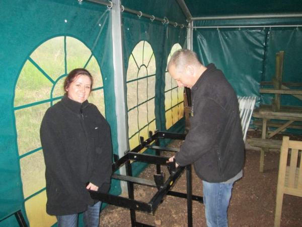 12. Julia & Pete Snashall came down from Kent yesterday for Richard Burgess's funeral service. This morning they took advantage of being here to prepare the stillages for the beer barrels in advance of the Spring Gala.