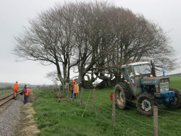 3. Martyn Budd's tractor with the generator in the rear bucket was providing the electricity for the nut runners helping to speed up the job. Down at the beech trees already...