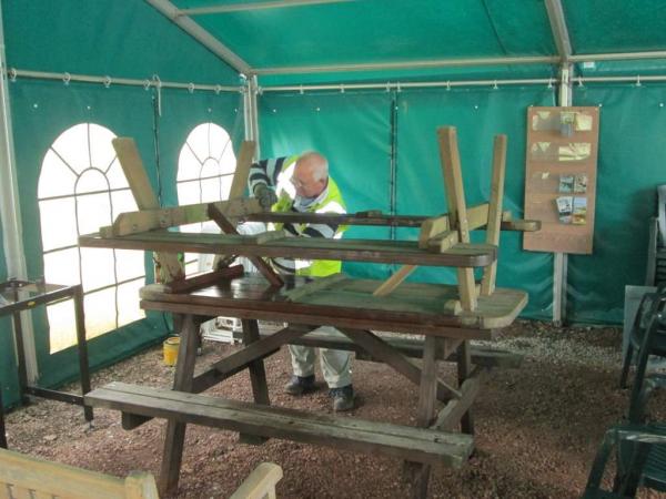 13. Later in the marquee, Nigel Spencer was busy painting wood treatment onto the picnic tables.