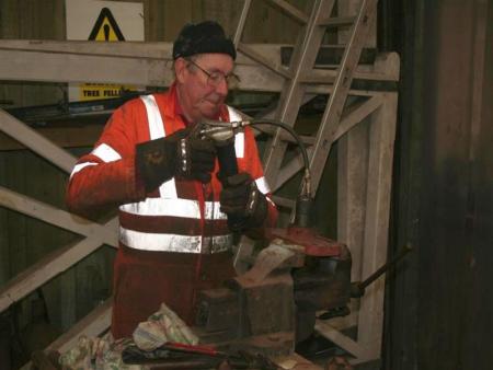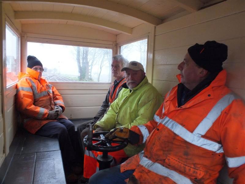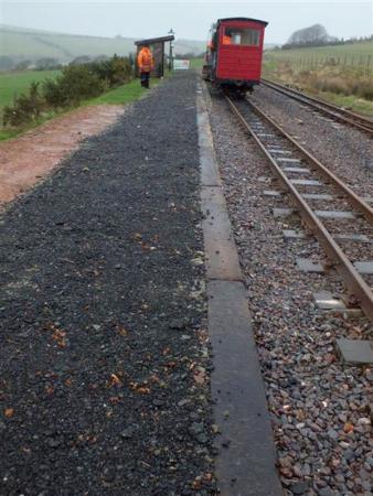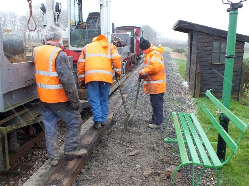 A five-man gang travelled in the works train to Killington Lane to complete the platform works required to accommodate the heritage coaches. The weather conditions were not good, with a biting wind and driving sleet giving us the incentive not to hang around.