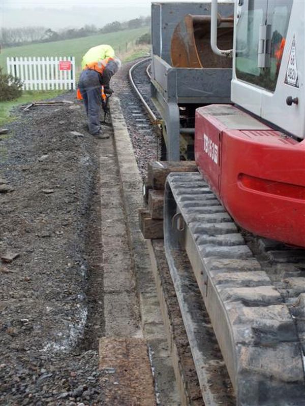 The bed for the sleeper edges was excavated and cleaned, the sleepers placed and the voids backfilled. All that is now needed is for some tidying up and compacting of the platform surface for it all to be ready.