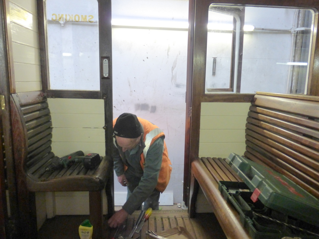 12. Jim Price fettled a carriage door catch while Dave Evans (in an un-photographable location) re-painted the floors of the open air section of the same carriage.