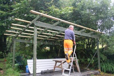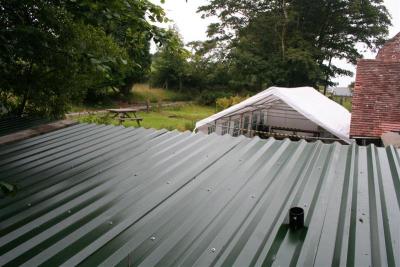 6. Richard & Brian fix the first of the corrugated roof sections in place.
