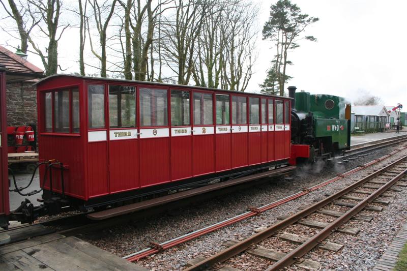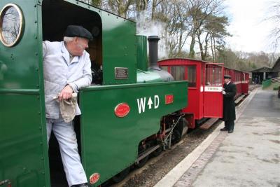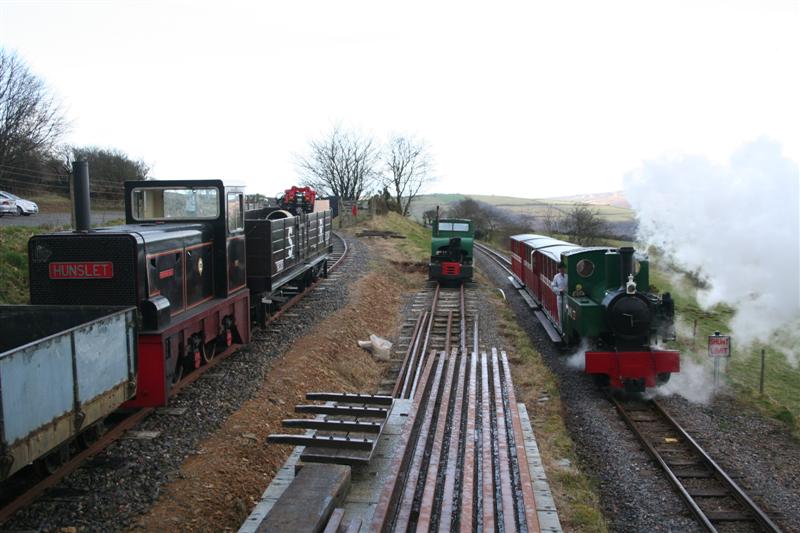 4. AXE (right) arrives at Woody Bay with the passenger train passing HEDDON HALL (left) during a shunt move and stored Simplex TITCH (centre).