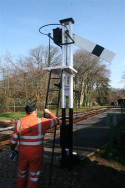 4. Dick Gunn paints a final top coat on the Up Starter signal post.
