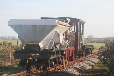 6. The works train was carefully formed up with the ballast hopper positioned ready to receive the surplus ballast dug out. The Brake Van provided transport for the volunteers and dogs with the hand tools carried on the bogie flat wagon.