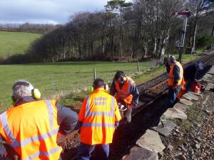15. Some of the track gang resumed work after the tea break by replacing an old sleeper near the turnout between the headshunt and transhipment siding.