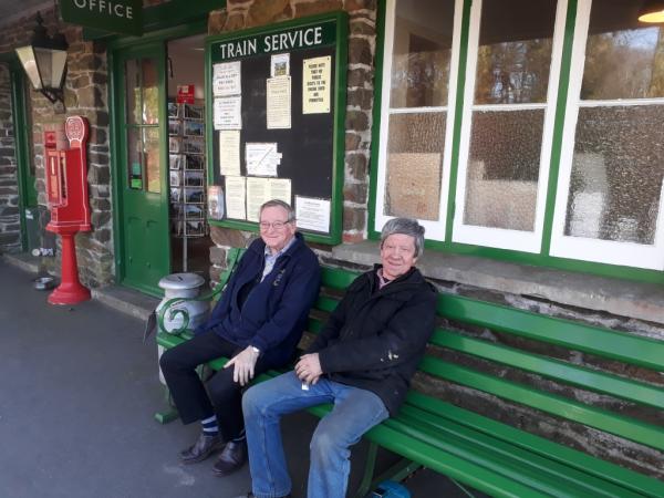 13. Relaxing on the platform bench are member of the shop staff Tony Cross and man of many talents, 'Dave Evans.