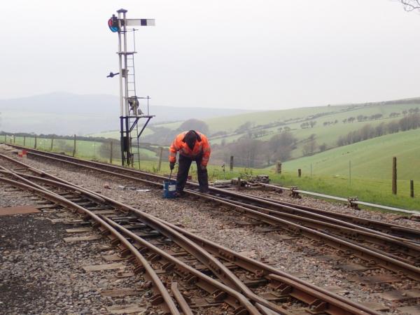 3. However, around the station work goes on. Under grey skies lone volunteer, Don, greases points...