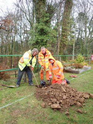 13. ..and, Dave (a different one!), Dave (the same one!) and Don dug a hole for installing a heritage cast iron post which has been in store. The white lines visible on the grass in these pictures are to define the areas of the platform from which the grass is to be stripped pending resurfacing with chippings to create a proper platform surface.