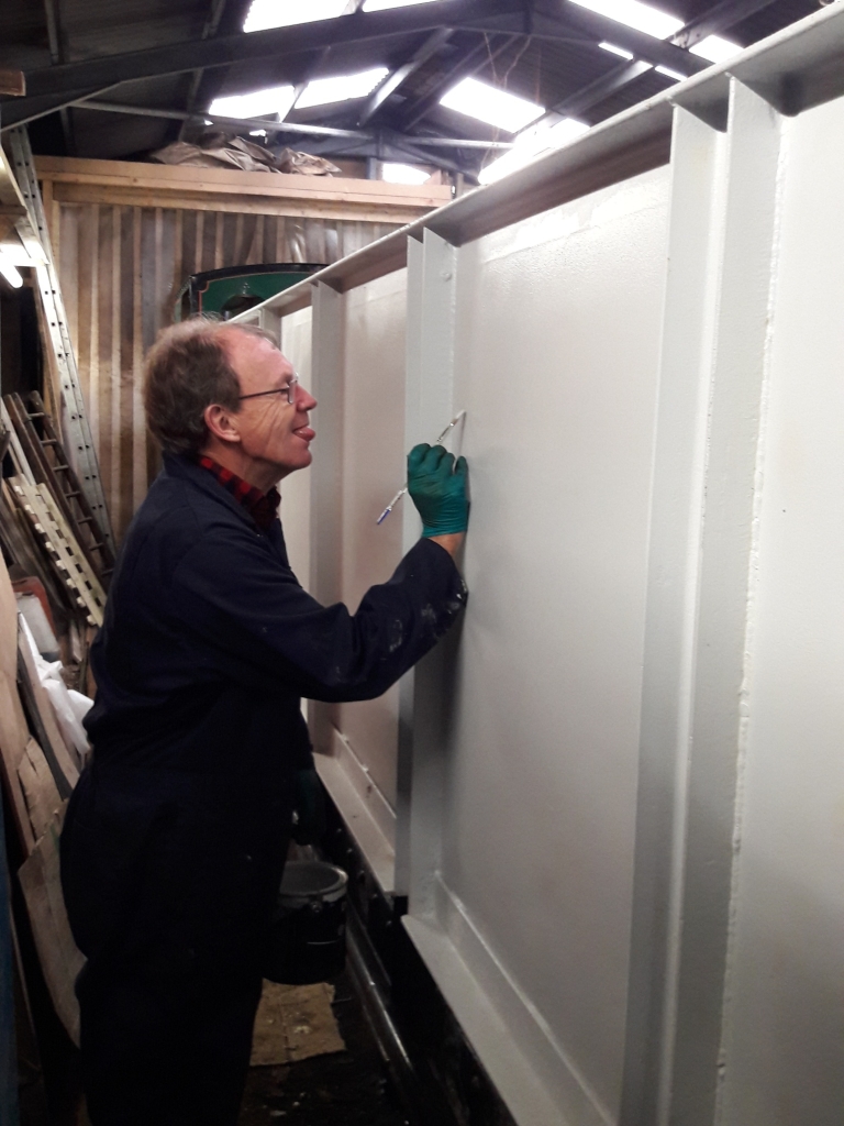9. In the shed, Barrie Cann, using a rather small brush, puts the finishing touches to the repainted ballast wagon.