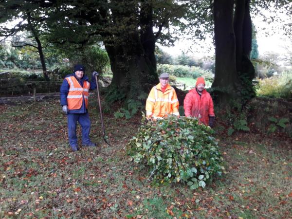 6. Thursday Gang regulars Keith Lamprey and Graham Rust are joined by Ian James in clearing away a couple of overhanging and fallen branches from the grassy area above the shed in preparation for this area to house a marquee for the Gala weekend.