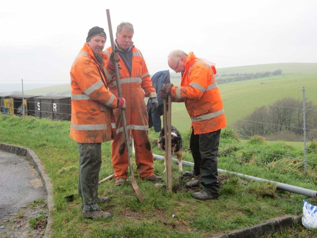 3. Next job was to dig another post hole. Nigel Thompson poses with Dave and Jim whilst the hole is dug near the car park entrance.