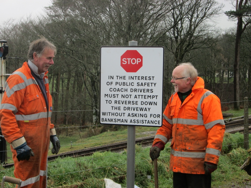 4. Dave and Jim admire their handiwork. The sign came about because of the increasing volume of coaches - some with drivers unfamiliar with reversing down to the station combined with a greater number of visitors walking about.