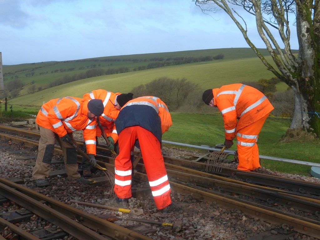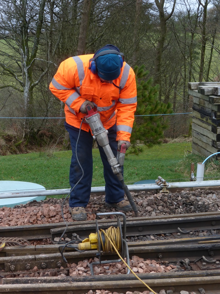 1. The first job today was replacement of two sleepers in the point-work at the station throat. Although sleeper replacement has become a routine operation, this job was complicated by the rail formation, the length of the sleepers and the proximity of the point rodding and signal cabling. Consequently more ballast than usual had to be removed before the sleepers could be released.