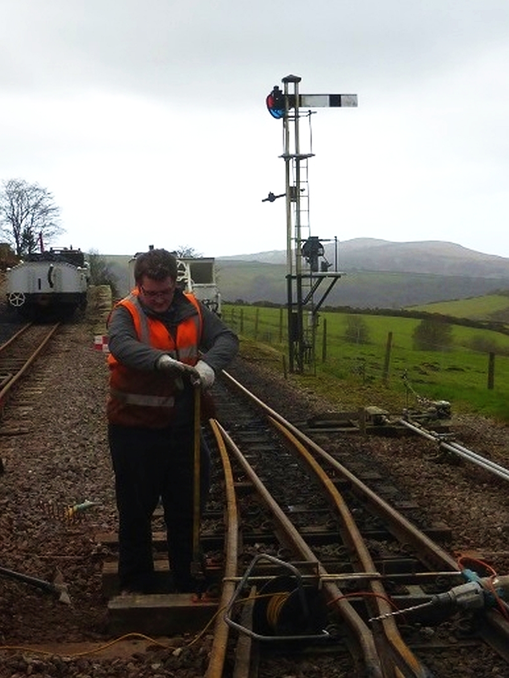 2. With the new sleepers manoeuvred into position, holes were drilled and the plates fastened down. New (youthful!!) gang member Peter Batstone tries his hand at track screw fastening.