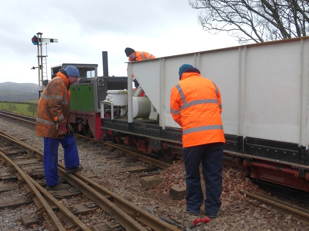 3. The removed ballast was of poor condition, so Graham brought the ballast wagon up and new ballast was dropped into place. Here, Don operates the hopper wagon doors, while Dave checks the distribution, under the watchful eye of General Manager Martyn Budd.