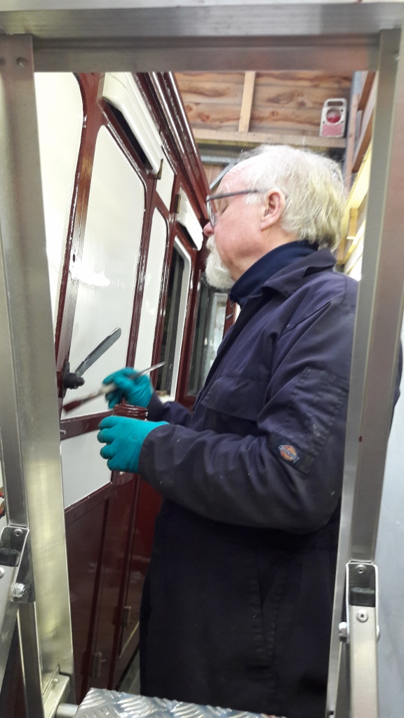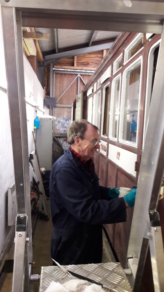 11. & 12. While most of the gang were working outside in the strong winds, a smiling Barrie Cann and Jim Pounds were cosseted (?) in the paint shop. Our photographers are always trying to find new ways of portraying the seemingly endless carriage painting. This week they have been artistically framed by their step ladders!