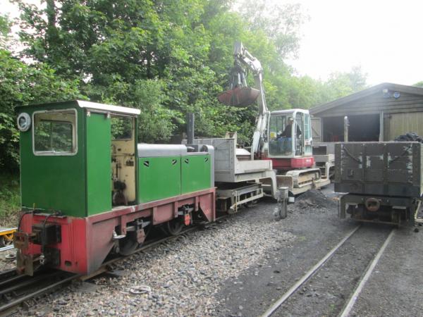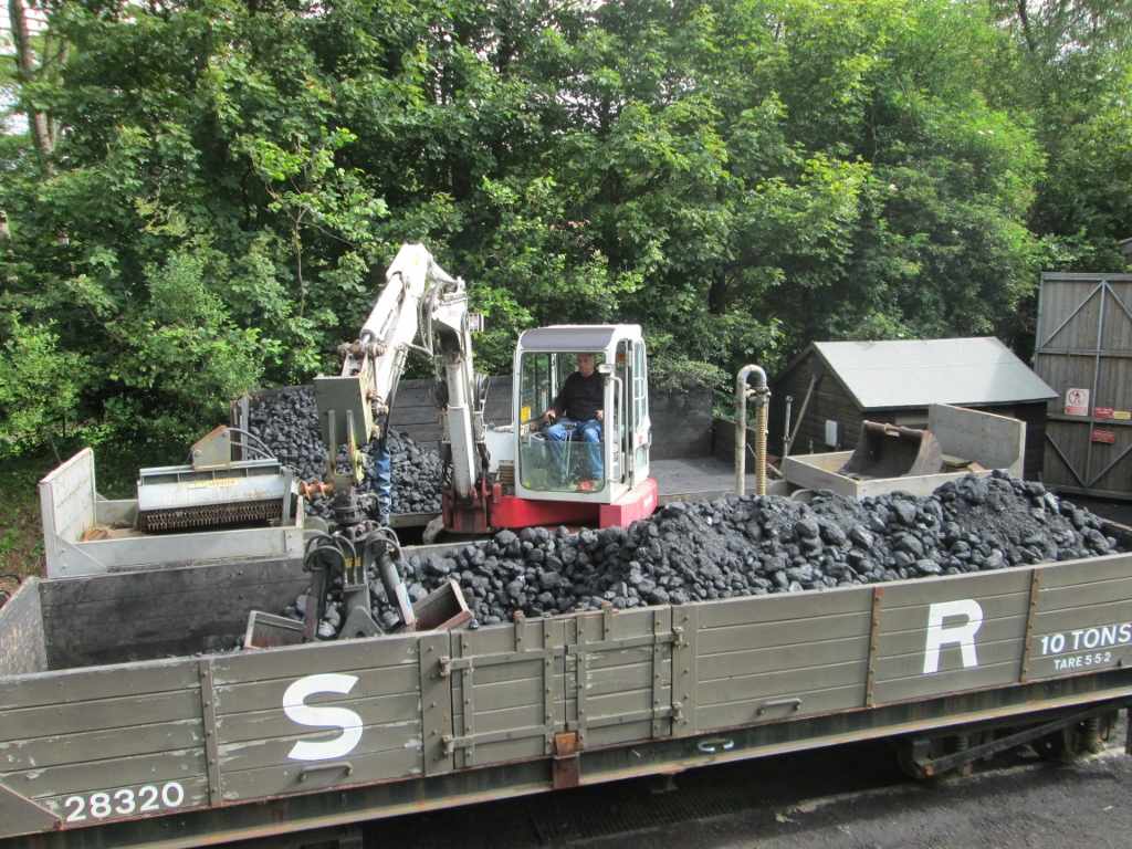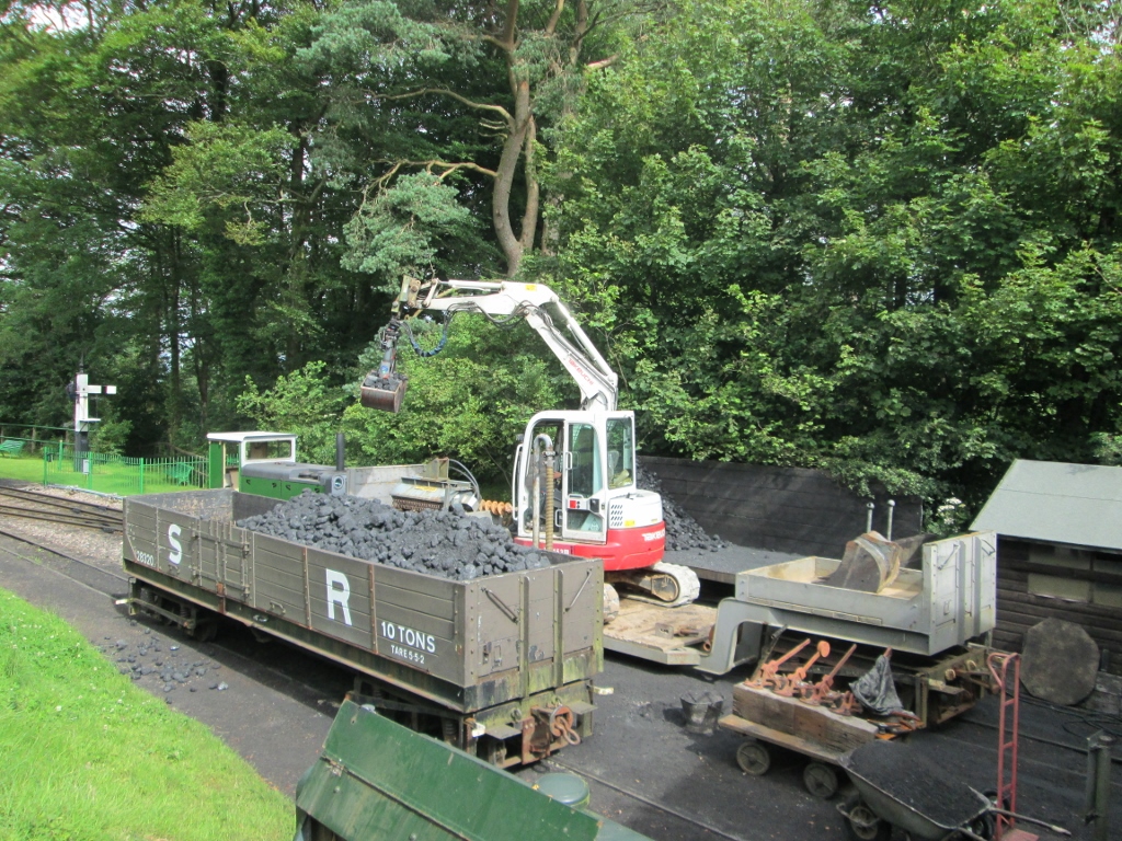 2. An essential task - usually unrecorded - is the replenishment of the coaling stage. The works train first positions the SR bogie open wagon on the pit-side road, then the excavator on the well wagon by the coaling stage.