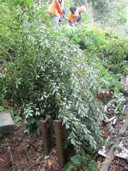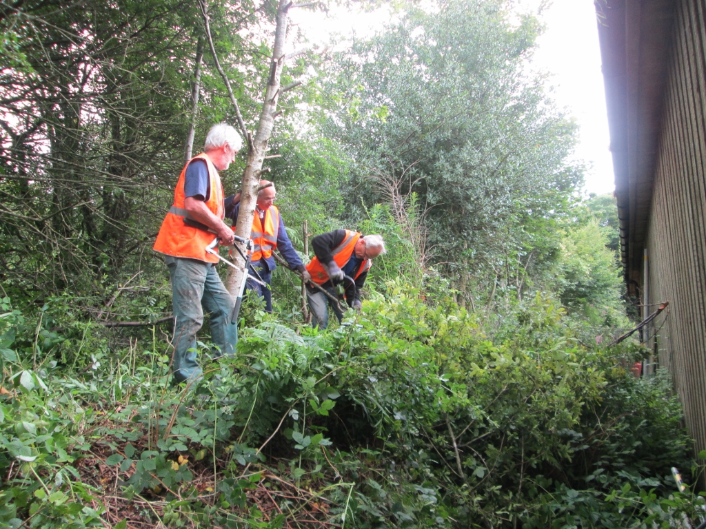 5. Trees and brambles have grown out of control on the Moorlands side of the shed. The gang begin cutting down the growth to provide access to the side of the shed.