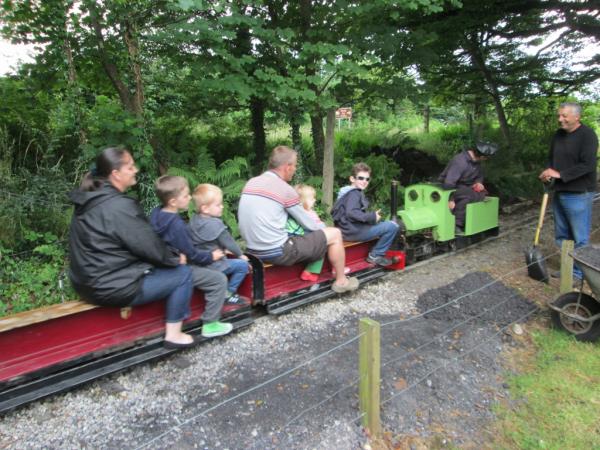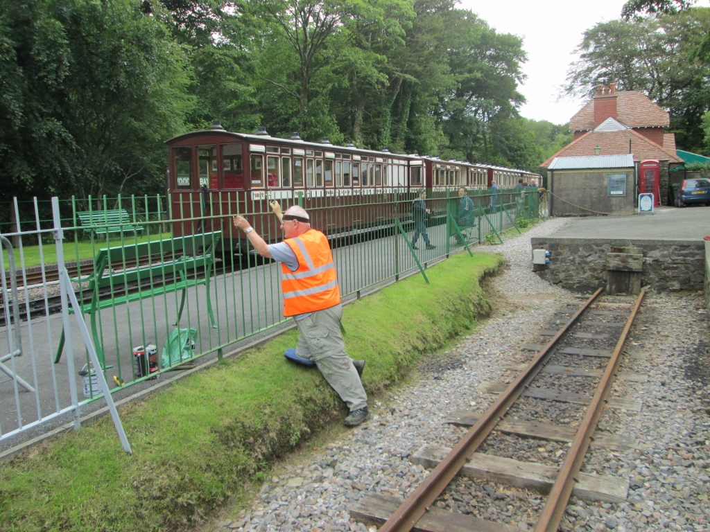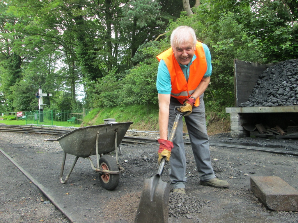 14. The miniature railway was very busy today. Here, John Uphill drives past Martyn Budd, who was spreading ash alongside the trackbed.